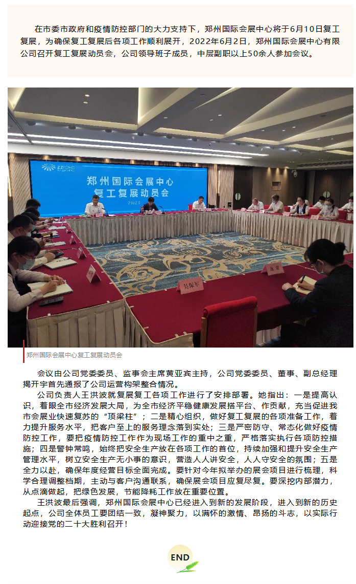 首頁新聞中心展會新聞文章詳情 文章詳情 昂揚斗志、多措并舉,積極做好會展中心復工復展工作 在市委市政府和疫情防控部門的大力支持下,鄭州國際會展中心將于6月10日復工復展,為確保復工復展后各項工作順利展開,2022年6月2日,鄭州國際會展中心有限公司召開復工復展動員會,公司領導班子成員,中層副職以上50余人參加會議。