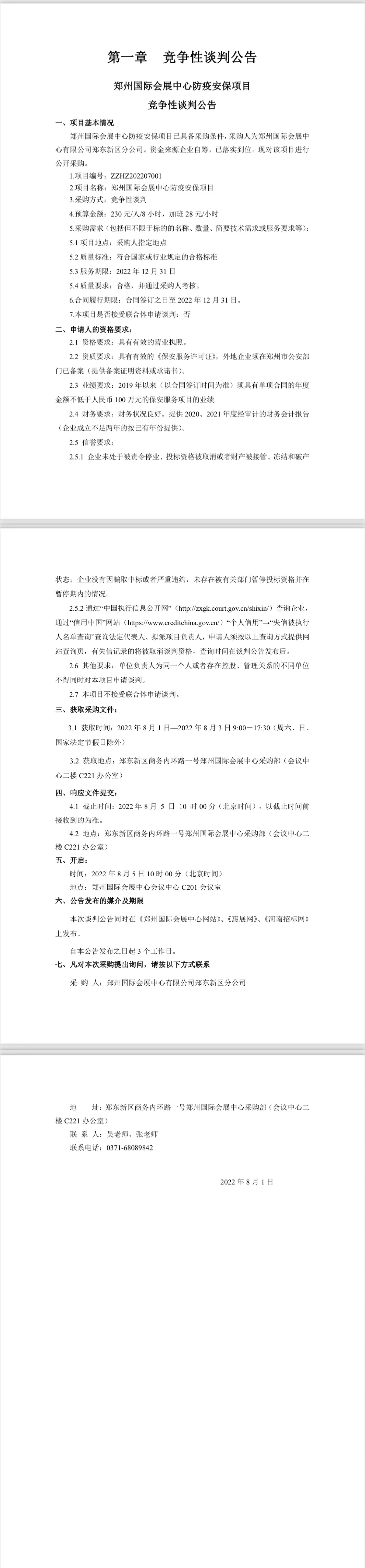 鄭州國(guó)際會(huì)展中心防疫安保項(xiàng)目 競(jìng)爭(zhēng)性談判公告