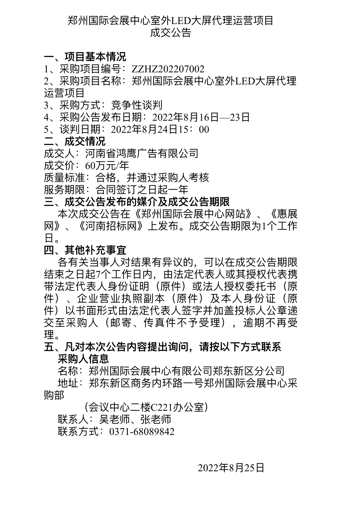 鄭州國際會展中心室外LED大屏代理運營項目 成交公告