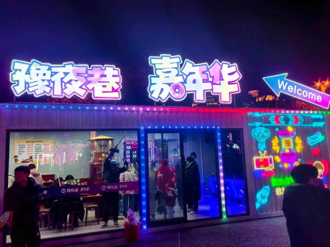夜幕低垂,華燈初上。豫夜巷整篇街區(qū)都被節(jié)日的氛圍點(diǎn)亮。各商戶門前霓虹閃爍,彩燈交織,夾雜著游客們自帶的氣球、新年配飾,營造出一種夢(mèng)幻而又溫馨的氛圍。在街區(qū)內(nèi),各商戶早已做好準(zhǔn)備,各式各樣的促銷活動(dòng)、特色小吃、游玩設(shè)施琳瑯滿目,吸引著各個(gè)年齡層的游客駐足流連。